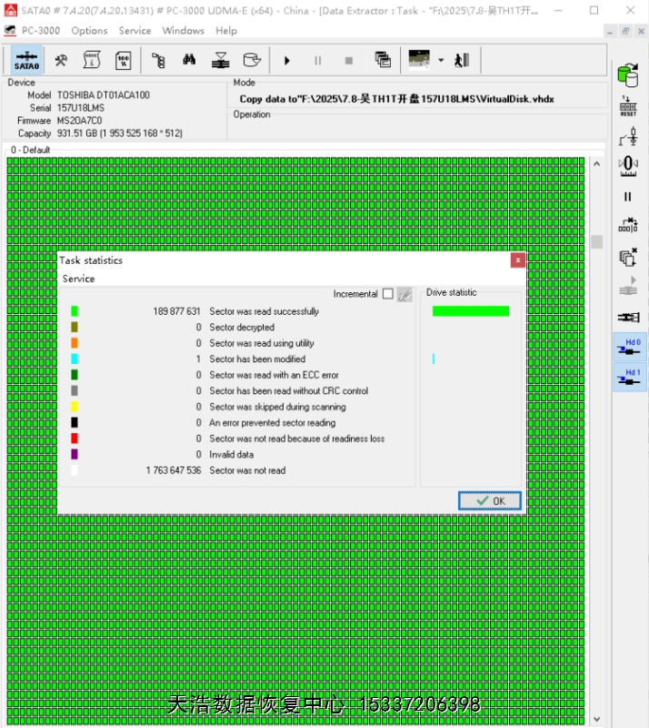 解决方案:收到硬盘后,在无尘环境更换兼容的磁头,再接到专业数据恢复工具ACE PC3000 UDMA EXPRESS上,通电硬盘正常认盘,备份好固件,DE分头镜像,最后客户硬盘内的重要数据基本完美恢复!