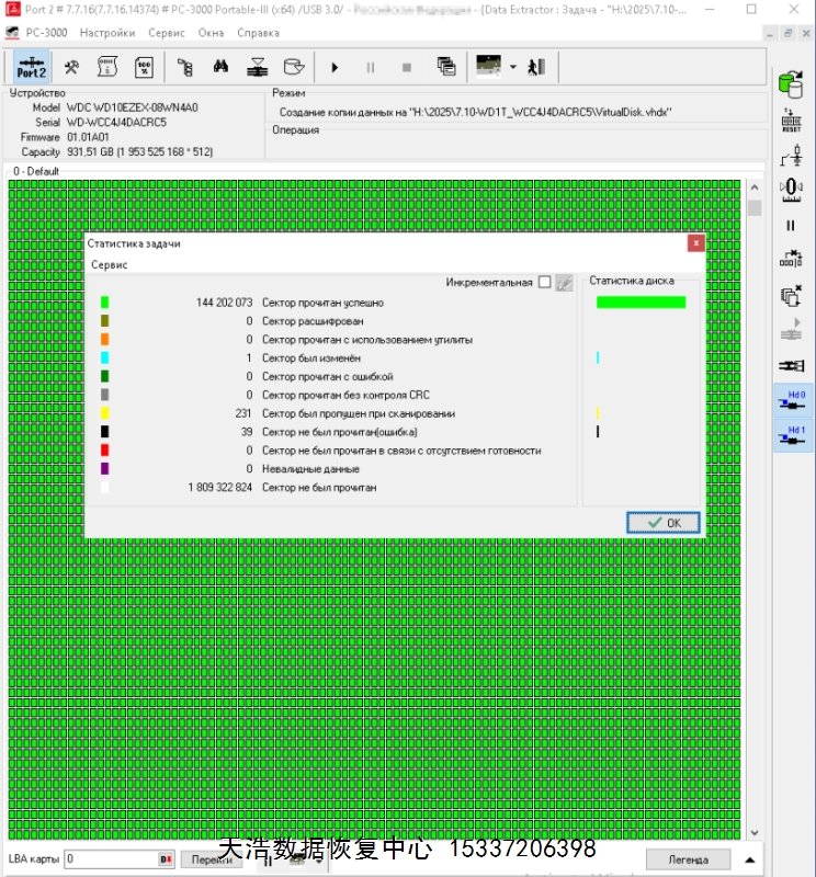 解决方案:收到硬盘后,在无尘环境更换兼容的磁头后,接到专业数据恢复工具ACE PC-3000 Portable 3上,通电硬盘认盘,备份好关键固件,做好恢复的前处理工作后,DE分头镜像,最后成功恢复客户硬盘内几乎全部数据!