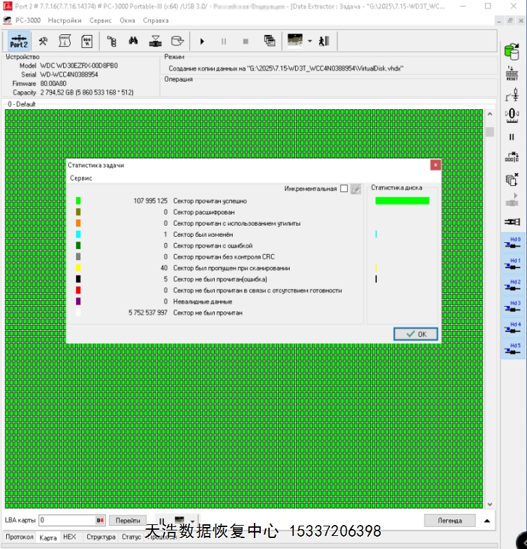 解决方案:收到硬盘后,在无尘环境更换兼容的磁头后,接到专业数据恢复工具ACE PC-3000 Portable 3上,通电认盘,备份固件,做好镜像前的处理工作后,DE分头镜像,最后成功恢复硬盘内几乎全部数据!