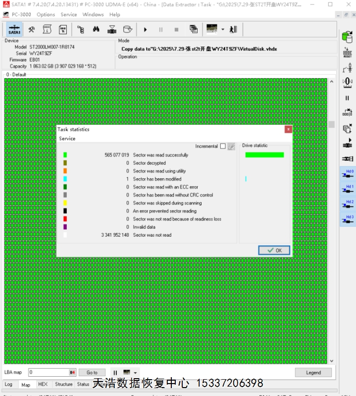 解决方案:收到硬盘后,在无尘环境拆开,更换兼容的磁头,接到数据恢复工具ACE PC-3000 UDMA Express上,通电硬盘正常认盘,做好恢复前的固件备份、处理工作后,DE分头镜像,最后客户硬盘内重要数据基本完美恢复!