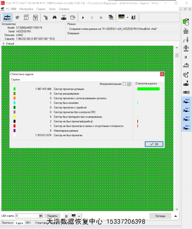 解决方案:收到硬盘后,在无尘环境拆开,更换兼容的磁头,接到数据恢复工具ACE PC-3000 Portable 3上,通电硬盘正常认盘,做好恢复前的固件备份、处理工作后,DE分头镜像,最后客户硬盘内重要数据基本完美恢复!