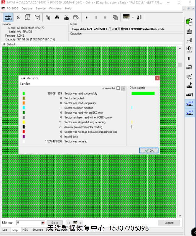 解决方案:收到硬盘后,在无尘环境拆开硬盘,更换兼容的磁头,接到数据恢复工具PC-3000 UDMA Express上,通电硬盘正常认盘,备份关键固件,做好镜像前的处理工作,DE分头镜像,最后客户硬盘内的数据基本完美恢复!
