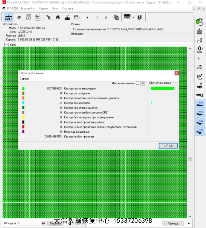 解决方案:收到硬盘后,在无尘环境拆开,更换兼容的磁头,接到数据恢复工具ACE PC-3000 Portable 3上,通电硬盘正常认盘,做好恢复前的固件备份、处理工作后,DE分头镜像,最后客户硬盘内重要数据基本完美恢复!