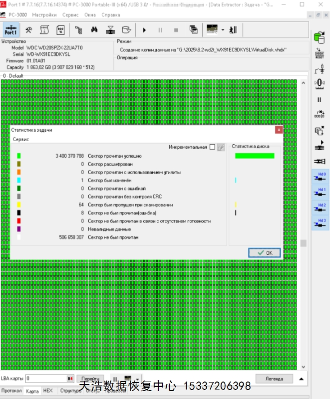 解决方案:收到硬盘后,我们在无尘环境开盘,更换兼容的磁头,原板解锁,接到专业数据恢复工具ACE PC-3000 Portable 3上,通电硬盘正常认盘,备份好关键固件后,做好镜像前的处理工作后,DE分头镜像,最后客户硬盘内重要数据基本完整恢复!
