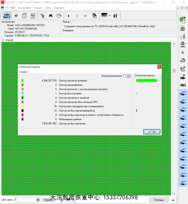 故障现象:WD My Passport 6T原装移动硬盘,认盘,全盘00,同行检测190坏,读不出来!