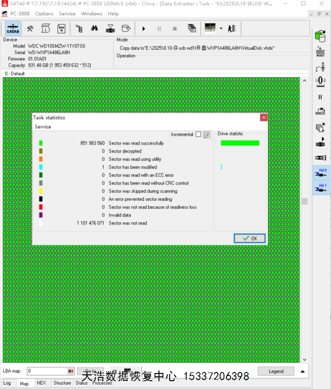 解决方案:收到硬盘后,我们在无尘环境开盘,更换兼容的磁头,原始usb板解锁飞线改SATA,接到专业数据恢复工具ACD PC-3000 UDMA Express上,通电硬盘正常认盘,备份好关键固件后,做好镜像前的处理工作后,DE分头镜像,最后客户硬盘内重要数据基本完整恢复!