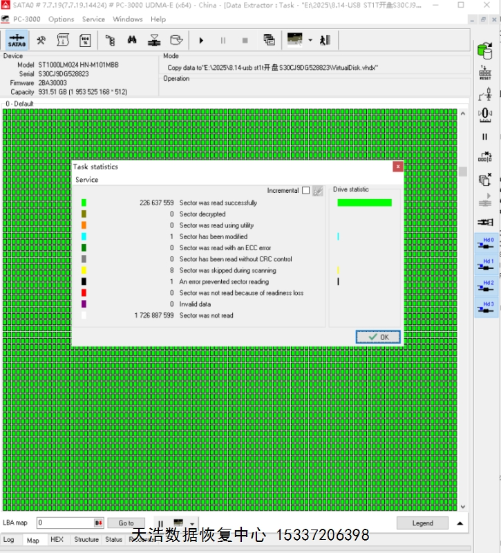 解决方案:收到硬盘后,接到专业数据恢复工具PC-3000 UDMA Express上,通电进程序,发现终端不停的跑出错代码,这种一般都是有头不良了,通过虚拟处理,备份好固件,做好镜像前的准备工作后,DE分头镜像,发现2头坏,先镜像013面,再在无尘环境更换兼容的磁头,通电正常认盘,继续镜像,最后成功恢复硬盘内全部重要数据!