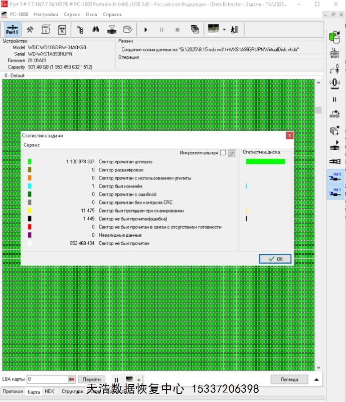 解决方案:收到硬盘后,在无尘环境更换兼容的磁头,原ROM解锁,原usb板飞线,接到专业数据恢复工具ACE PC-3000 Portable III上,通电硬盘认盘,备份好关键固件,做好前期处理工作后,DE分头镜像,最后客户硬盘内重要数据大部分成功恢复!