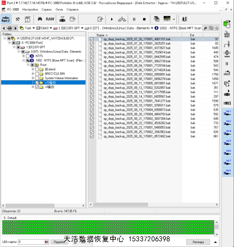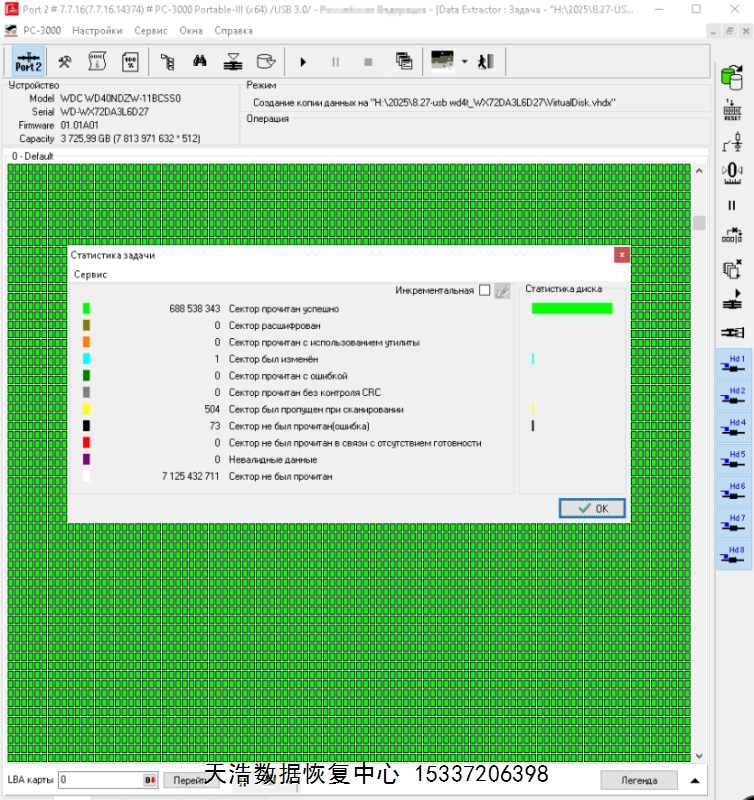 解决方案:收到硬盘后,在无尘环境更换兼容的磁头,原ROM解锁,原usb板飞线,接到专业数据恢复工具ACE PC-3000 Portable III上,通电硬盘认盘,备份好关键固件,做好前期处理工作后,DE分头镜像,最后客户硬盘内重要数据大部分成功恢复!