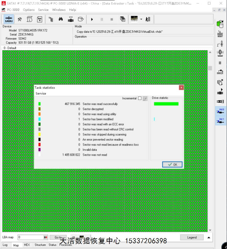 解决方案:收到硬盘后,在无尘环境拆开硬盘,更换兼容的磁头,接到数据恢复工具PC-3000 UDMA Express上,通电硬盘正常认盘,备份关键固件,做好镜像前的处理工作,DE分头镜像,最后客户硬盘内的重要数据基本完整恢复!