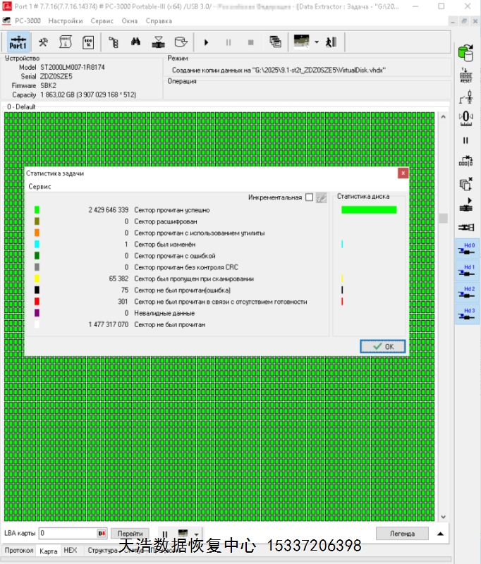 解决方案:收到硬盘后,在无尘环境拆开,更换兼容的磁头,接到数据恢复工具ACE PC-3000 Portable 3上,通电硬盘正常认盘,做好恢复前的固件备份、处理工作后,DE分头镜像,最后客户硬盘内重要数据大部分成功恢复!
