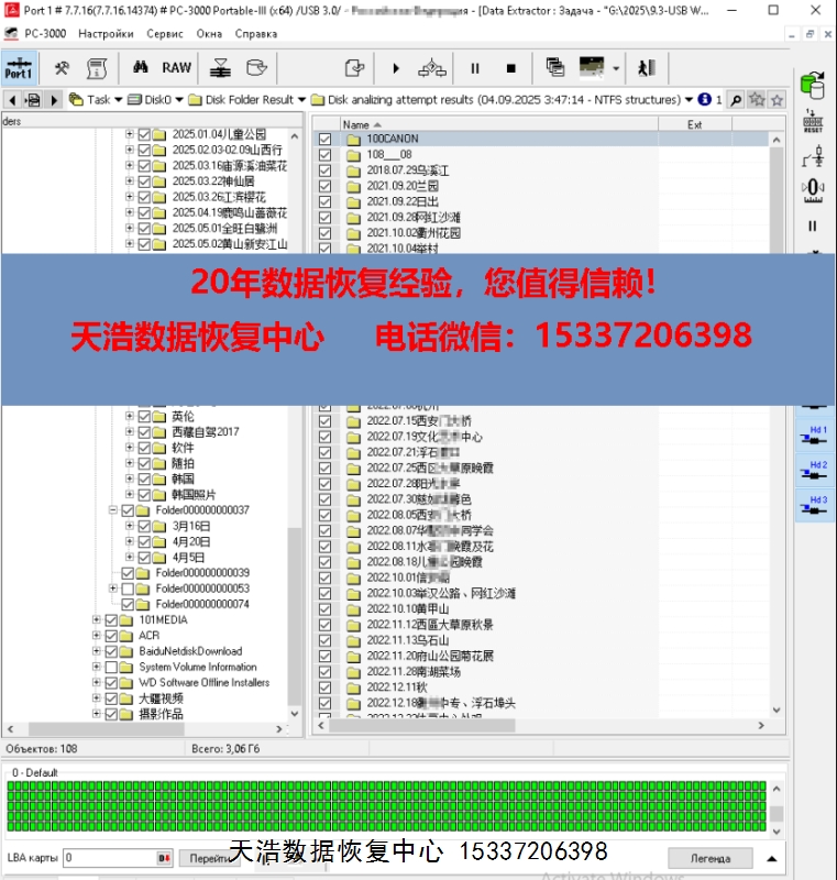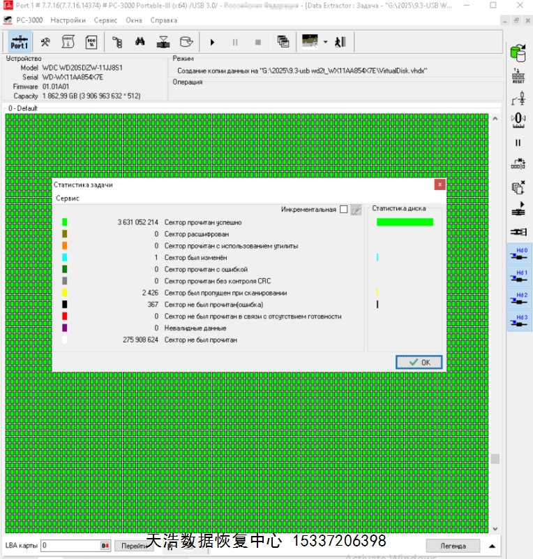解决方案:收到硬盘后,在无尘环境更换兼容的磁头,原ROM解锁,原始usb板飞线改SATA,接到专业数据恢复工具ACE PC-3000 Portable III上,通电硬盘认盘,备份好关键固件,做好前期处理工作后,DE分头镜像,最后客户硬盘内的重要数据基本完整恢复!