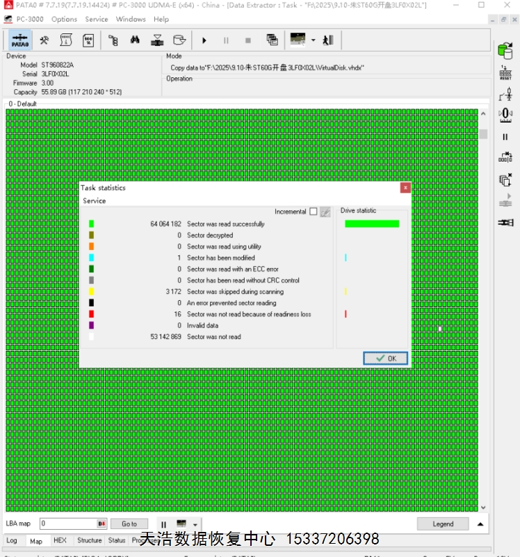 解决方案:收到硬盘后,在无尘环境拆开硬盘,更换兼容的磁头,接到数据恢复工具ACE PC-3000 UDMA Express上,通电硬盘正常认盘,做好镜像前的处理工作后,DE分头镜像,最后客户硬盘内的重要数据基本完美恢复!