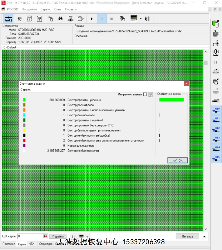 解决方案:收到硬盘后,我们在无尘环境拆开,更换兼容的磁头,再接到数据恢复工具ACE PC-3000 Portable 3 上,硬盘正常认盘,DE分头镜像,最后硬盘内的重要数据大部分成功恢复!