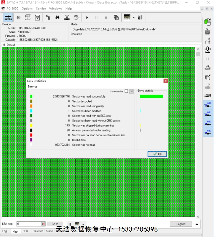 解决方案:收到硬盘后,我们在无尘环境更换兼容的磁头,接到数据恢复工具PC3000 UDMA EXPRESS上,通电声音正常认盘正常,DE镜像,成功恢复客户硬盘内几乎全部重要数据。