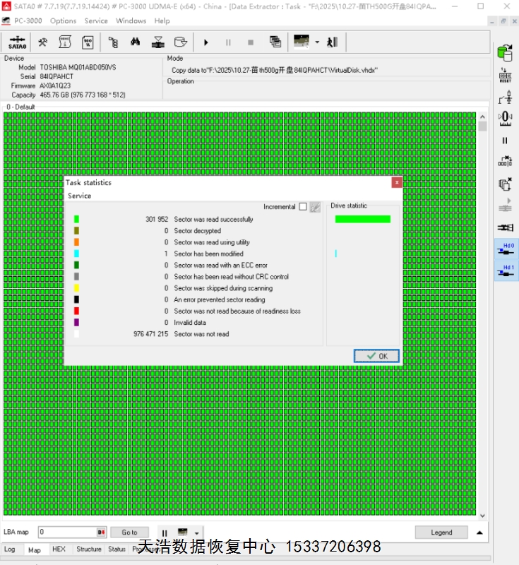 解决方案:收到硬盘后,在无尘环境拆开,更换兼容的磁头,接到数据恢复工具ACE PC3000 UDMA EXPRESS上,通电正常认盘,DE分头镜像,最后客户硬盘内的重要数据基本完美恢复。