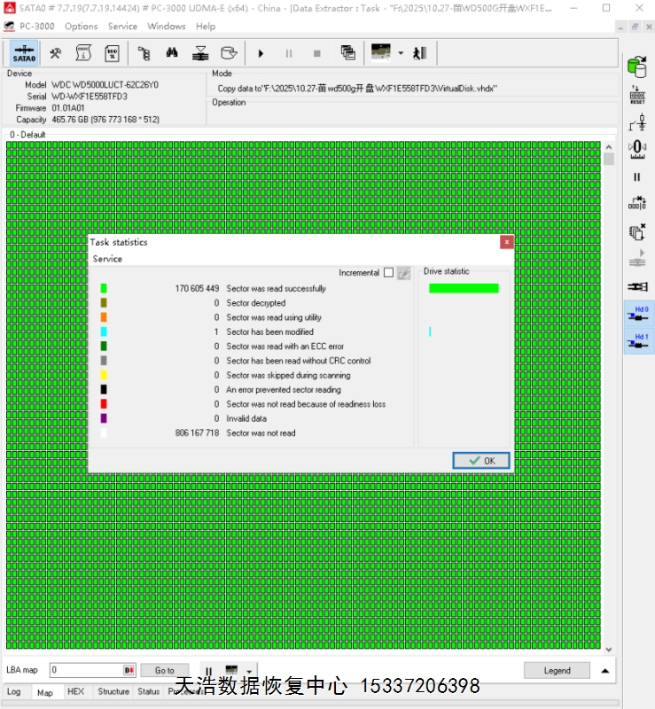解决方案:收到硬盘后,接到专业数据恢复工具ACE PC3000 UDMA EXPRESS上,通电硬盘认盘,备份好关键固件,检测发现1头坏,在无尘环境更换兼容的磁头,通电硬盘正常认盘,做好前期处理工作后,DE分头镜像,最后客户硬盘内的重要数据完整恢复!