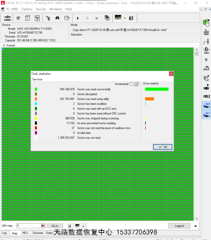 解决方案:收到硬盘后,在无尘环境更换兼容的磁头,原ROM解锁,原usb板飞线,接到专业数据恢复工具ACE PC-3000 UDMA Express上,通电硬盘认盘,备份好关键固件,做好前期处理工作后,DE分头镜像,最后客户硬盘内重要数据大部分成功恢复!