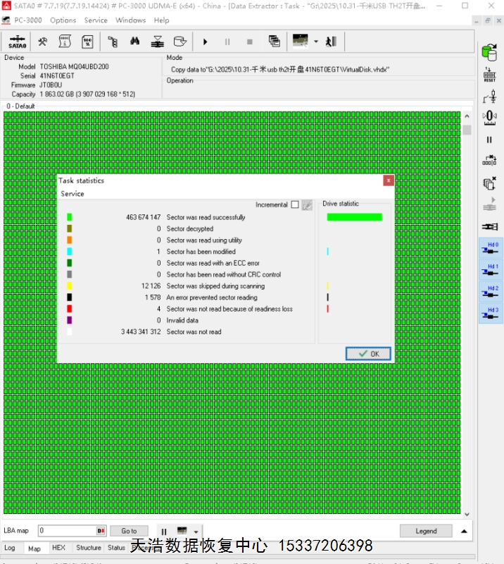 解决方案:收到硬盘后,我们在无尘环境更换兼容的磁头,更换兼容的SATA电路板,接到数据恢复工具PC3000 UDMA EXPRESS上,通电声音正常认盘正常,DE分头镜像,成功恢复客户硬盘内绝大部分重要数据。
