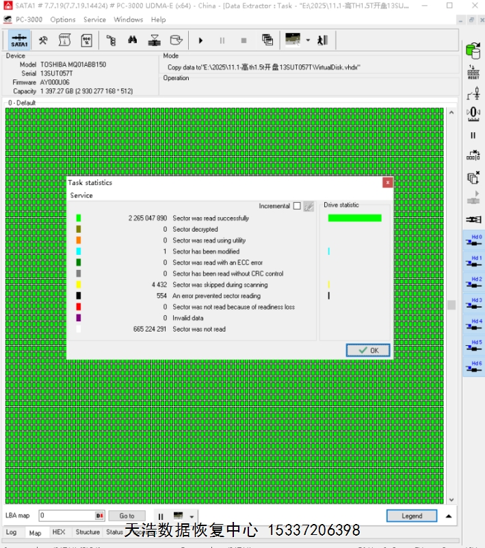 解决方案:收到硬盘后,我们在无尘环境更换兼容的磁头,接到数据恢复工具PC3000 UDMA EXPRESS上,通电声音正常认盘正常,DE分头镜像,最后客户硬盘内1T多的重要数据基本完整恢复。
