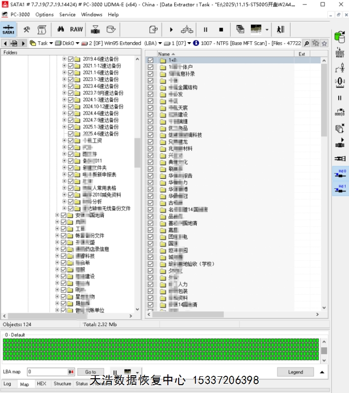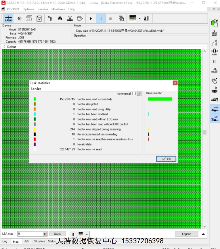 解决方案:收到硬盘后,在无尘环境拆开检测,发现盘片0面划伤,清洗盘片,做好限位处理后,更换兼容的磁头,接到数据恢复工具ACE PC-3000 UDMA Express上,通电正常认盘,备份好关键固件,做好DE恢复前的固件预处理工作后,分头镜像,最后客户硬盘内的重要数据基本完整恢复!包含硬盘内N多财务账套数据!