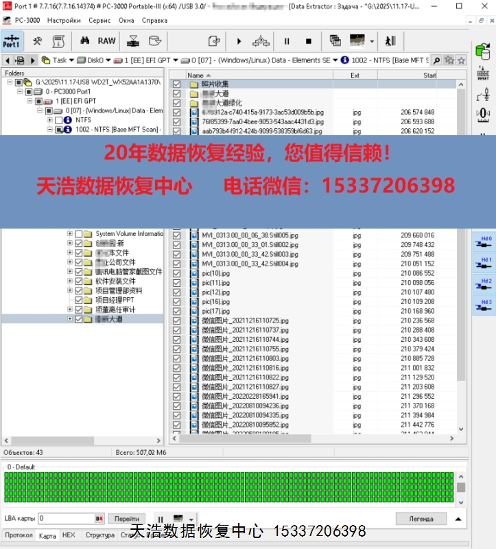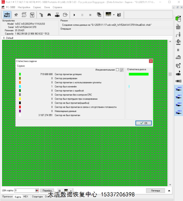 解决方案:收到硬盘后,在无尘环境更换兼容的磁头,原ROM解锁,原始usb板飞线改SATA,接到专业数据恢复工具ACE PC-3000 Portable 3上,通电硬盘认盘,备份好关键固件,做好前期处理工作后,DE分头镜像,最后客户硬盘内的重要数据基本完整恢复!