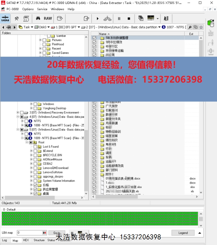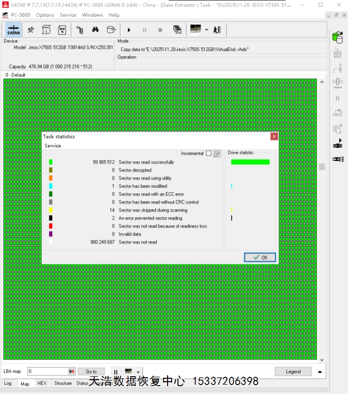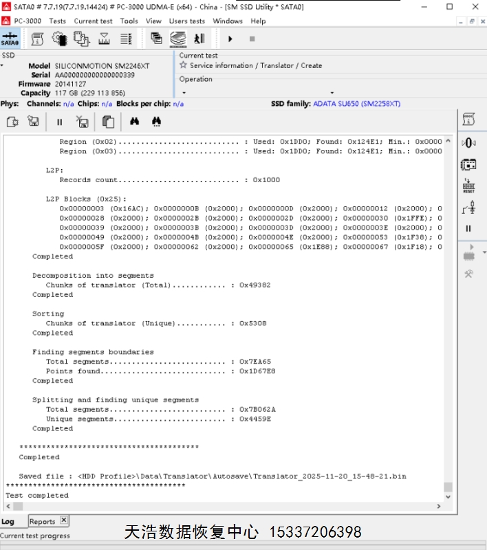 解决方案:收到硬盘后,我们使用专业的SSD恢复工具ACE PC-3000 UDMA Express上,短接通电就绪后,虚拟重建编译器,再用PC3000 DE虚拟镜像,基本完整恢复出客户硬盘内的重要数据!