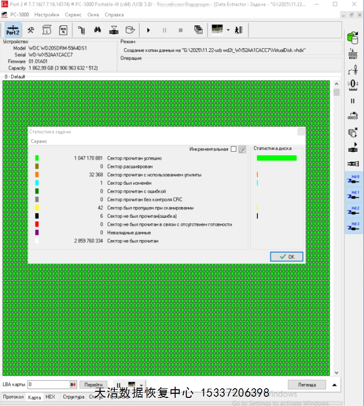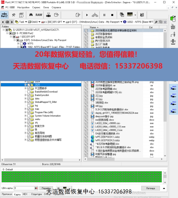 解决方案:收到硬盘后,原ROM解锁,原始usb板飞线改SATA,接到专业数据恢复工具ACE PC-3000 Portable 3上,通电硬盘不认盘,加载Ldr后,读不固件目录,检测磁头读写正常,搜索SA并做好备份,发现01和190损坏,处理好固件问题后,再次断电通电,硬盘正常认盘,做好前期处理工作后,DE分头镜像,最后客户硬盘内的重要数据基本完整恢复!