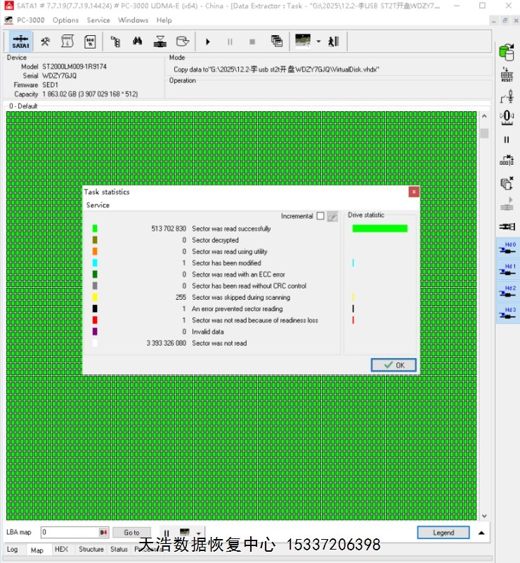 解决方案:收到硬盘后,在无尘环境拆开,清洗盘片后,更换兼容的磁头,接到数据恢复工具ACE PC-3000 UDMA Express上,通电硬盘正常认盘,做好数据恢复前的固件备份、处理工作后,DE分头镜像,最后客户硬盘内重要数据基本完整恢复!