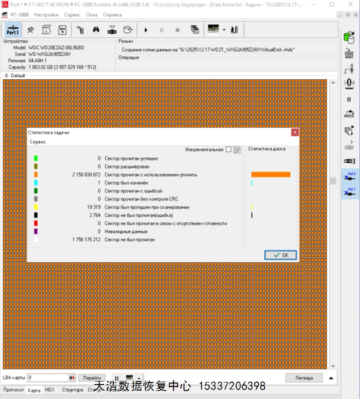 解决方案:收到硬盘后,在无尘环境更换兼容的磁头,再接到专业数据恢复工具ACE PC-3000 Portable 3上,原板解锁后,再通电硬盘正常认盘,备份好关键固件,做数据恢复前的处理工作后,DE分头镜像,成功恢复硬盘内客户单位的几乎全部重要数据!