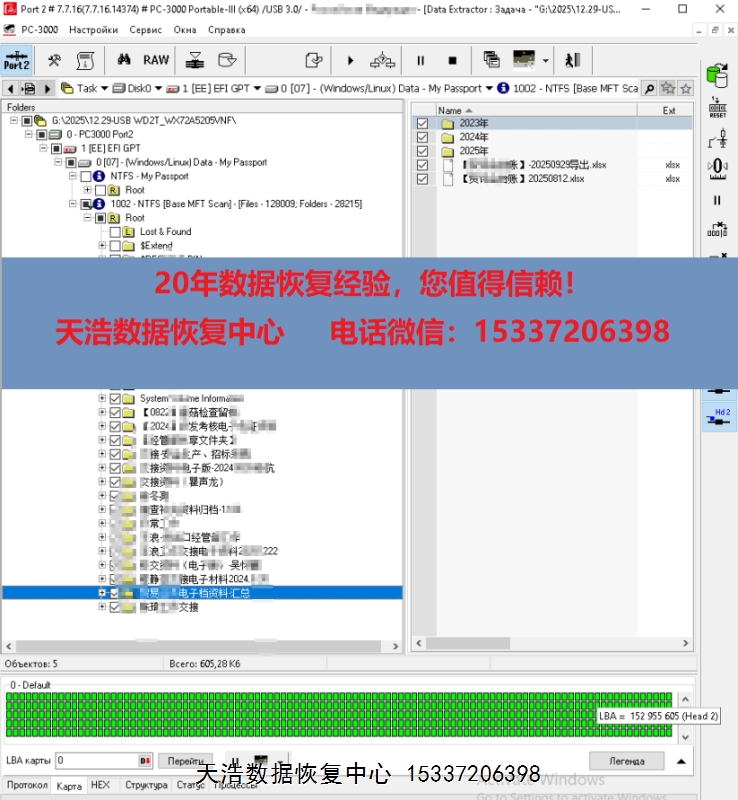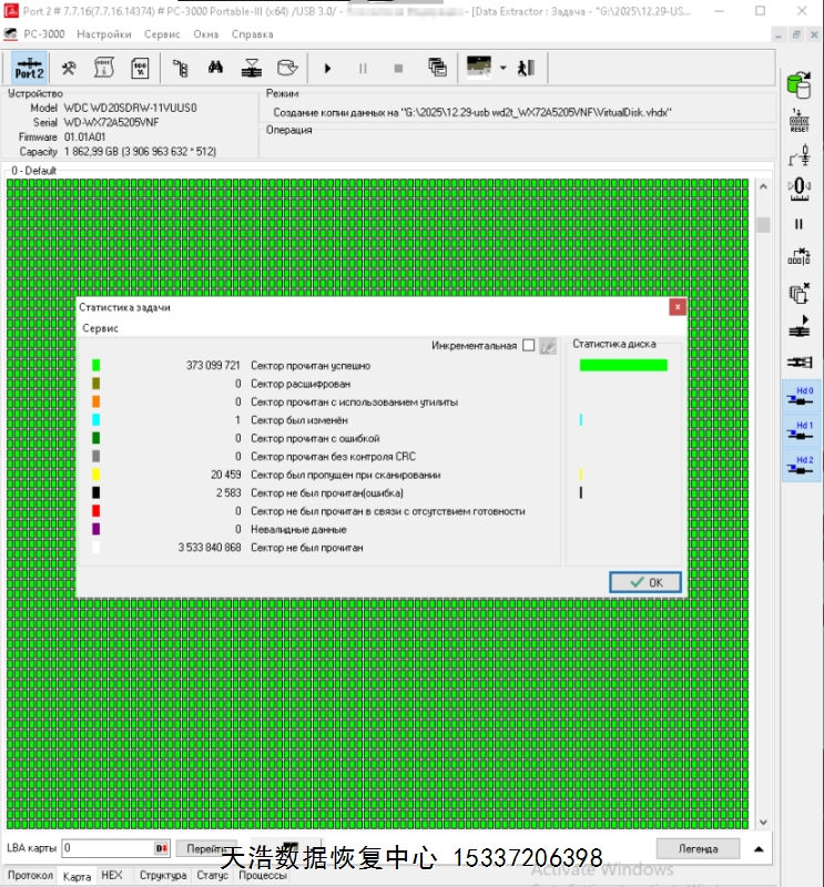 解决方案:收到硬盘后,在无尘环境更换兼容的磁头,原usb板飞线改sata,接到专业数据恢复工具ACE PC-3000 Portable 3上,通电硬盘认盘,备份好关键固件,做好前期处理工作后,DE分头镜像,最后客户硬盘内的重要数据大部分成功恢复!
