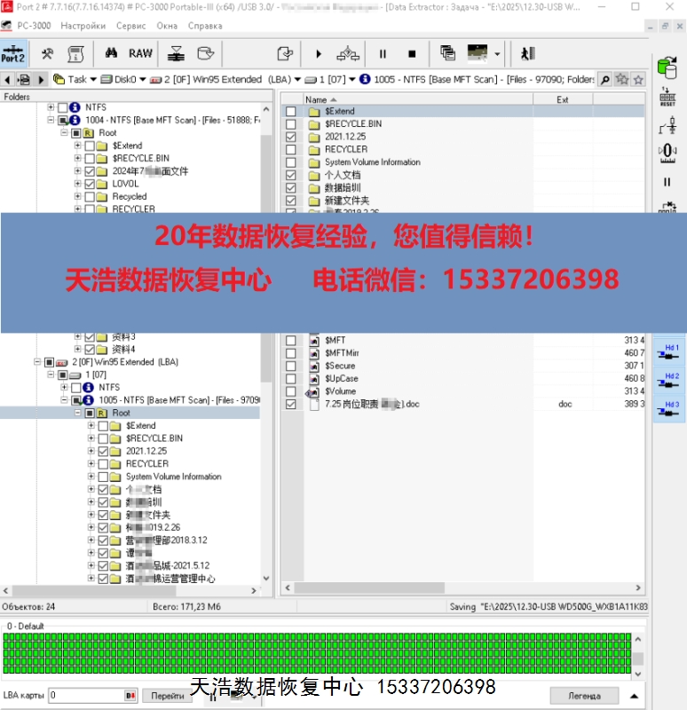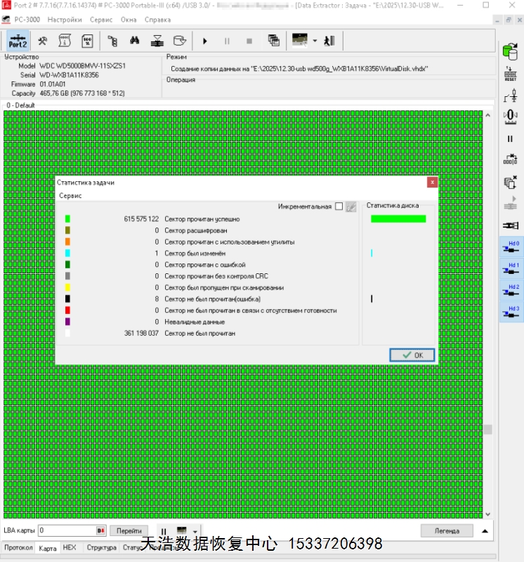 解决方案:收到硬盘后,在无尘环境更换兼容的磁头,更换兼容的SATA电路板,接到专业数据恢复工具ACE PC-3000 Portable 3上,通电硬盘正常认盘,做好前期处理工作后,DE分头镜像,最后客户硬盘内的重要数据基本完整恢复!