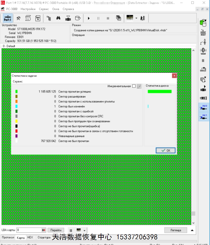 解决方案:收到硬盘后,在无尘环境更换兼容的磁头,接到专业数据恢复工具ACE PC-3000 Portable 3上,通电认盘,备份好固件,做好镜像前的准备工作后,DE分头镜像,最后成功完整恢复客户硬盘内的重要数据!