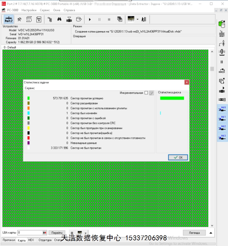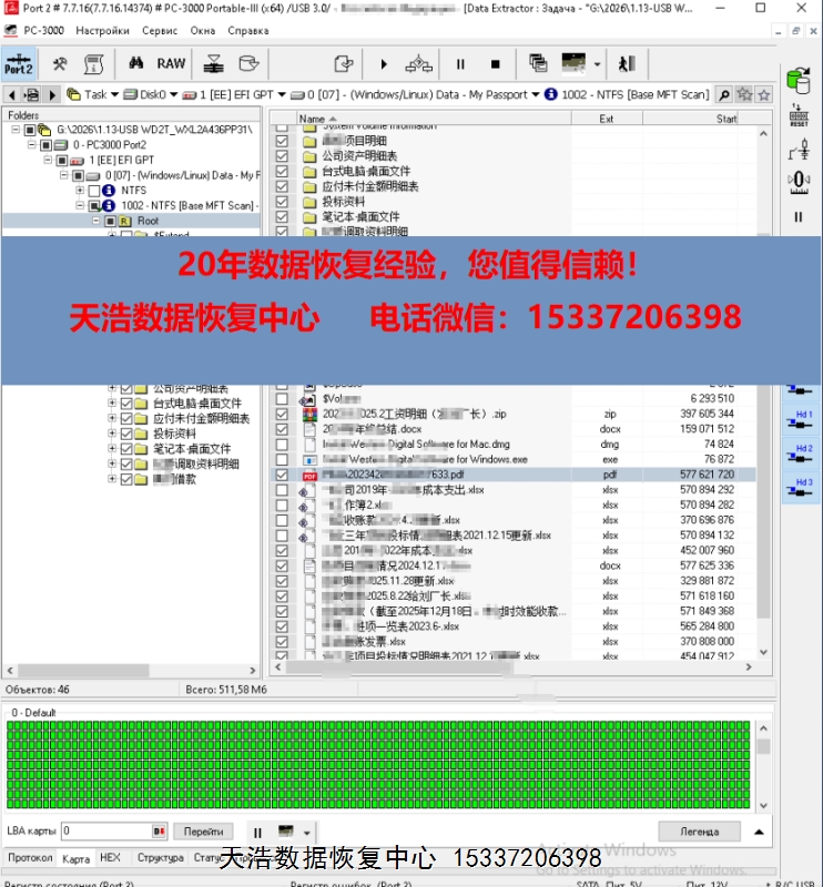解决方案:收到硬盘后,在无尘环境更换兼容的磁头,原ROM解锁,原始usb板飞线改SATA,再接到专业数据恢复工具ACE PC-3000 Portable 3上,通电硬盘认盘,备份好关键固件,做好前期处理工作后,DE分头镜像,最后客户硬盘内的重要数据基本完整恢复!