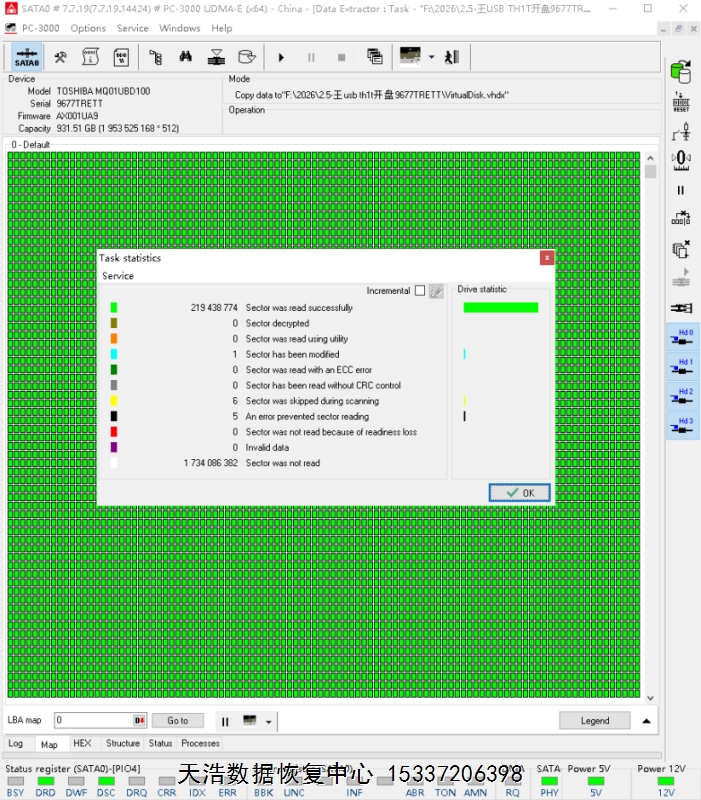 解决方案:收到硬盘后,我们在无尘环境更换兼容的磁头,更换兼容的SATA电路板,接到数据恢复工具PC3000 UDMA EXPRESS上,通电声音正常认盘正常,DE分头镜像,最后客户硬盘内重要数据基本完美恢复!