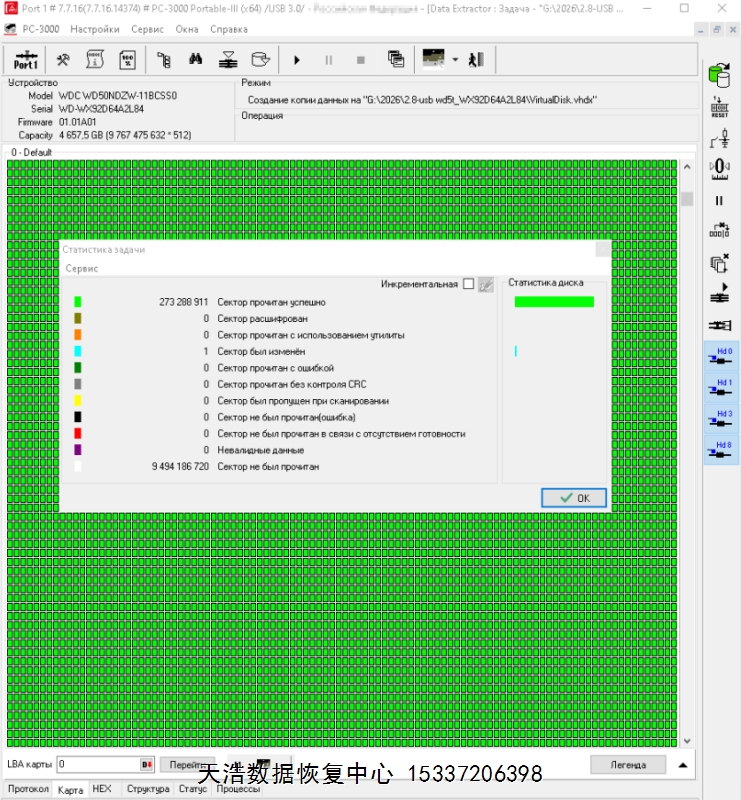 解决方案:收到硬盘后,在无尘环境更换兼容的磁头,原ROM解锁,原始usb板飞线改SATA,接到专业数据恢复工具ACE PC-3000 Portable 3上,通电硬盘认盘,备份好关键固件,做好前期处理工作后,DE分头镜像,最后客户硬盘内的重要数据基本完整恢复!
