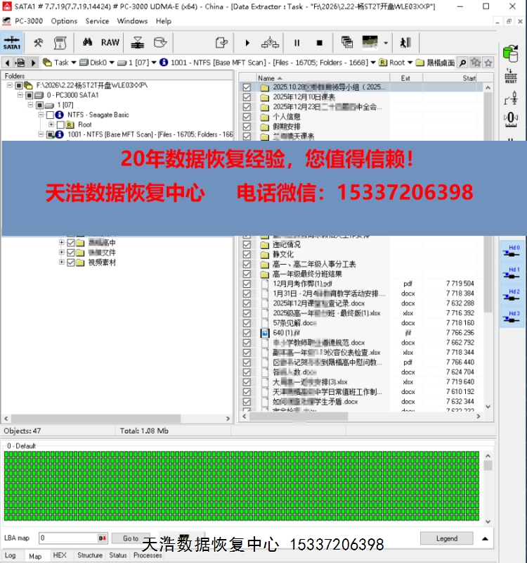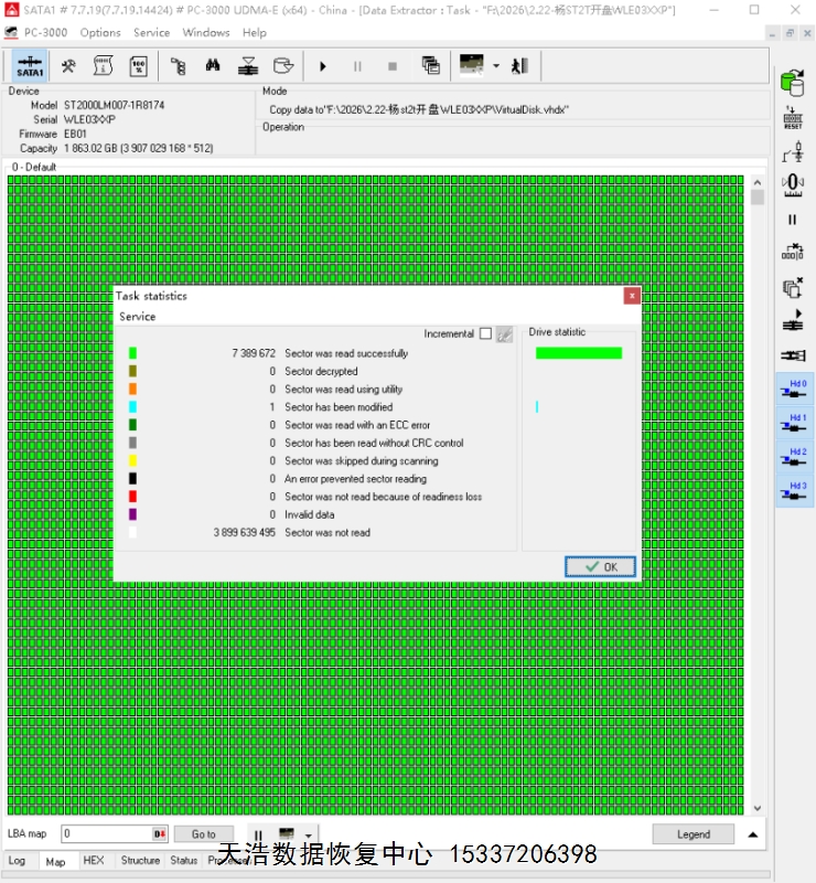 解决方案:收到硬盘后,在无尘环境拆开,更换兼容的磁头,接到数据恢复工具ACE PC-3000 UDMA Express上,通电硬盘正常认盘,做好恢复前的固件备份、处理工作后,DE分头镜像,最后客户硬盘内重要数据基本完整恢复!