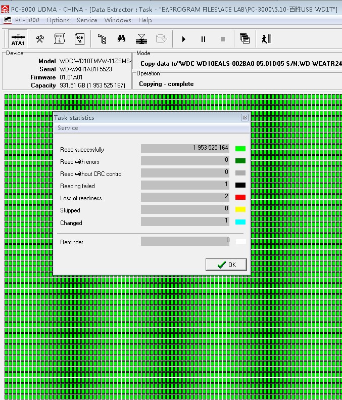 解决方案:这种情况一般都是磁头损坏,我们跟客户报价,客户同意后,在我们的备件库里找出兼容的备件,在无尘柜里面更换磁头,然后更换兼容的SATA电路板,再使用专业的数据恢复工具镜像,最后成功恢复客户需要的几乎所有的数据。
