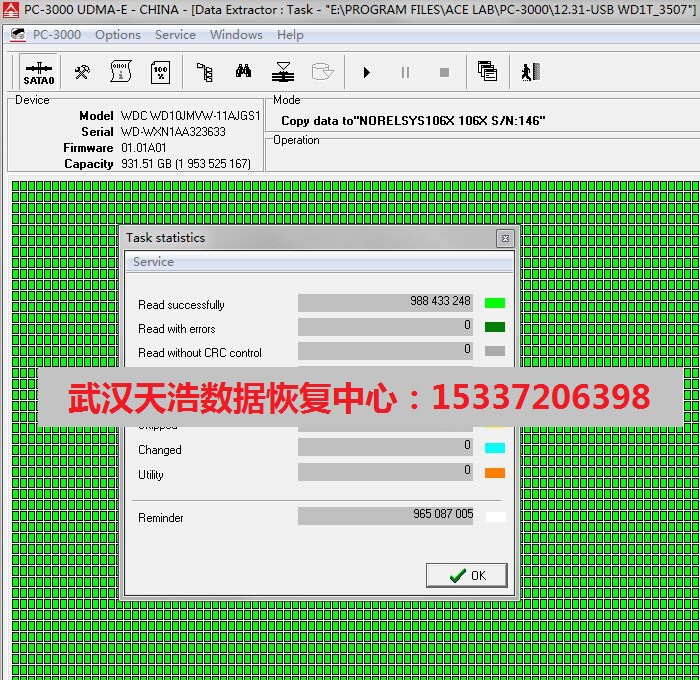 解决方案:接硬盘后,我更换匹配的SATA电路板,接上PC-3000 UDMA Express上,通过检测,发现是有一个磁头损坏,从我们的备件库里面找到匹配的磁头,在无尘柜里面更换,然后再接到数据恢复工具PC-3000 UDMA Express上,通电硬盘认盘很慢,处理固件后,最后成功恢复客户几乎全部的重要资料!