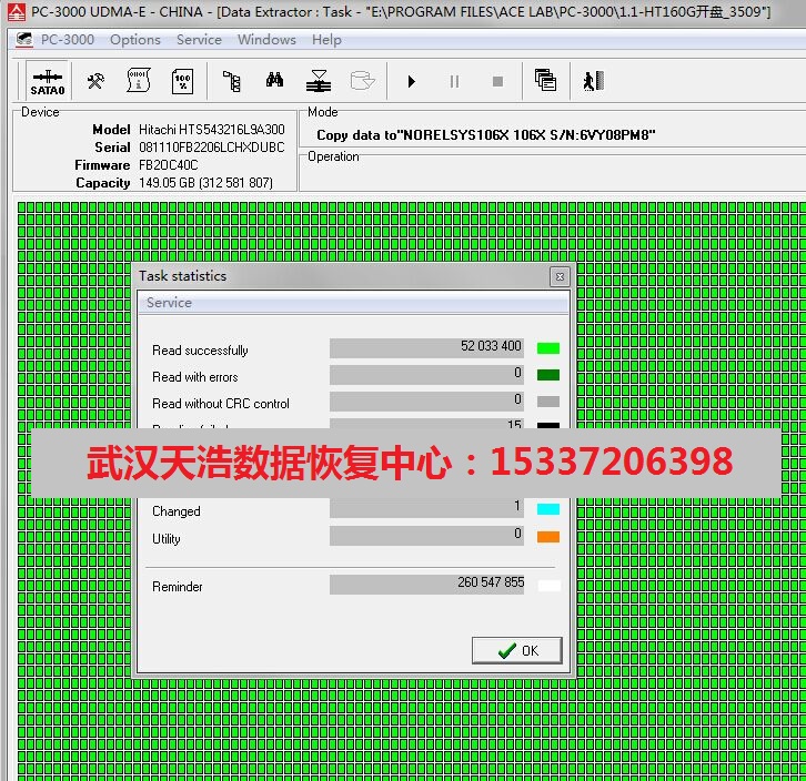 解决方案:磁头损坏,从我们的备件库里面找到匹配的磁头,在无尘柜里面更换,然后再接到数据恢复工具PC-3000 UDMA Express上,硬盘通电认盘,镜像成功恢复客户几乎全部的重要资料!