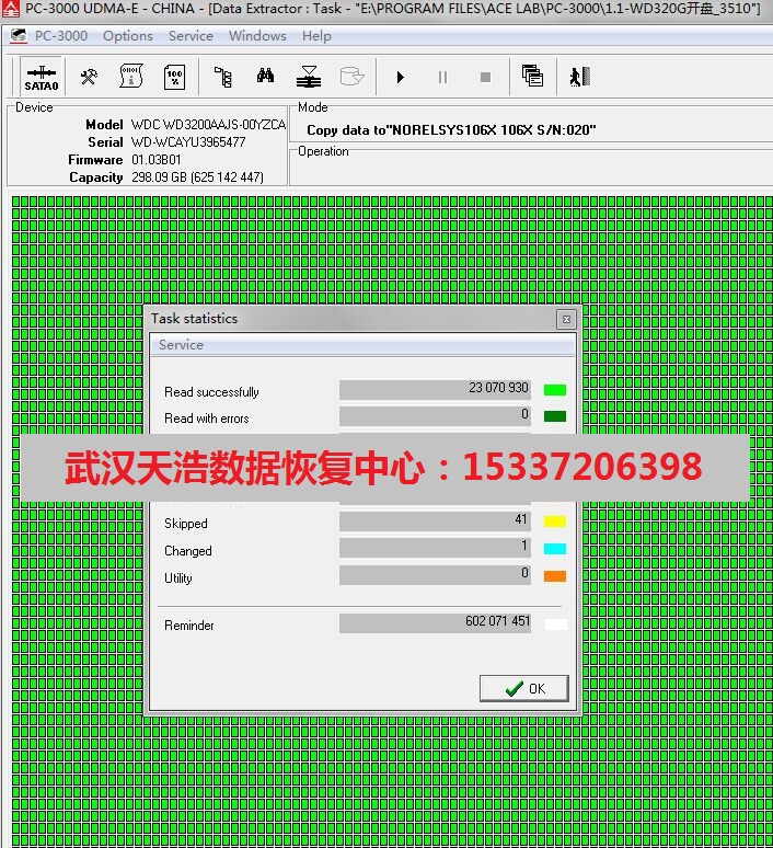 解决方案:磁头损坏,从我们的备件库里面找到匹配的磁头,在无尘柜里面更换,然后再接到数据恢复工具PC-3000 UDMA Express上,硬盘通电认盘,镜像成功恢复客户公司几乎全部的重要文档类资料!