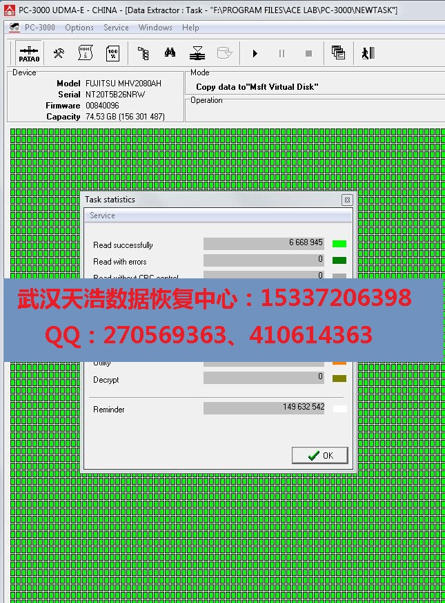解决方案:收到硬盘后,从我们的备件库找到匹配的备件,在无尘柜里面更换磁头,再接到数据恢复工具PC-3000 UDMA Express上,通电硬盘认盘,镜像,最后客户的重要资料几乎全部成功恢复!包含客户的程序!