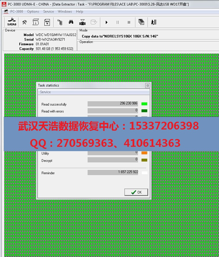 解决方案:收到硬盘后,从我们的备件库找到匹配的备件,在无尘柜里面更换磁头,再接到数据恢复工具PC-3000 UDMA Express上,通电硬盘认盘,镜像,成功恢复里面几乎全部的重要数据!