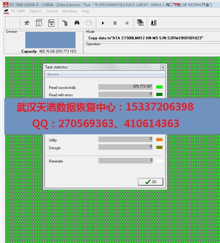 解决方案:收到硬盘后,从我们的备件库找到匹配的备件,在无尘柜里面更换磁头,再接到数据恢复工具PC-3000 UDMA Express上,通电硬盘认盘,镜像,成功恢复里面几乎全部的重要数据!