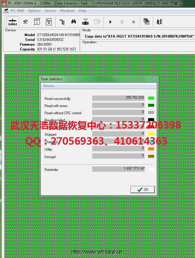 解决方案:收到硬盘后,从我们的备件库找到匹配的备件,在无尘柜里面更换磁头,再接到数据恢复工具PC-3000 UDMA Express上,通电硬盘认盘,镜像,成功恢复里面几乎全部的重要数据!