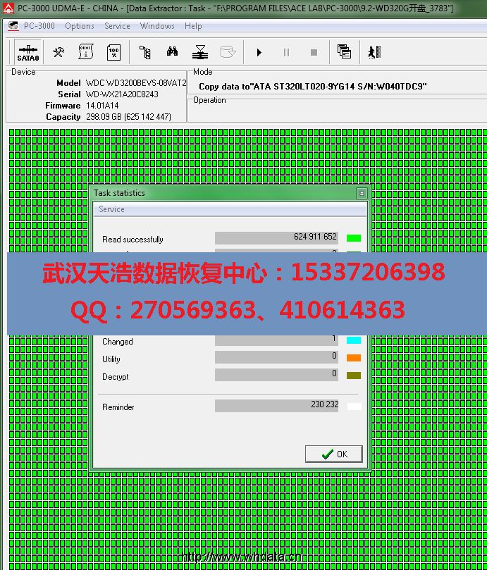 解决方案:收到硬盘后,从我们的备件库找到匹配的备件,在无尘柜里面更换磁头,再接到数据恢复工具PC-3000 UDMA Express上,通电硬盘认盘,镜像,客户数据几乎全部完美恢复!