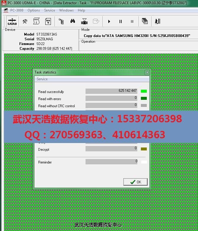 解决方案:收到硬盘后,更换匹配的磁头,再接到数据恢复工具PC-3000 UDMA Express上,通电检测发现硬盘固件有损坏,通过固件处理,最后硬盘认盘,镜像,客户单位的工作文件大部分成功恢复!