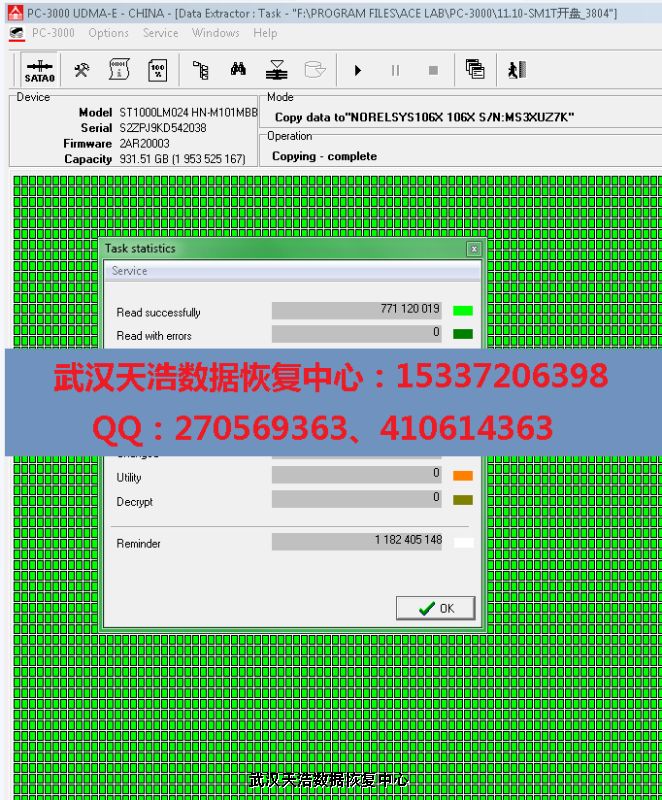 解决方案:收到硬盘后,从我们的备件库找到匹配的备件,在无尘柜里面更换磁头,再接到数据恢复工具PC-3000 UDMA Express上,通电硬盘认盘,镜像,成功恢复恢复客户单位的几乎全部数据!
