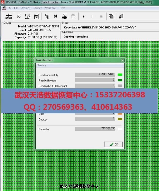 解决方案:收到硬盘后,从我们的备件库找到匹配的备件,在无尘柜里面更换磁头,再接到数据恢复工具PC-3000 UDMA Express上,通电硬盘认盘,镜像,成功恢复客户公司的几乎全部数据!