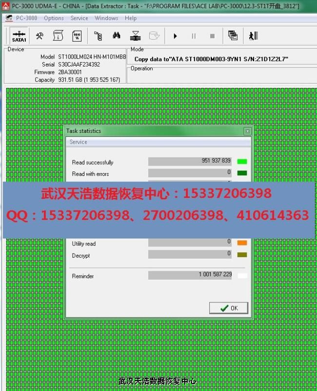 解决方案:收到硬盘后,从我们的备件库找到匹配的备件,在无尘柜里面更换磁头,再接到数据恢复工具PC-3000 UDMA Express上,通电硬盘认盘,镜像,成功恢复恢复客户的几乎全部数据!